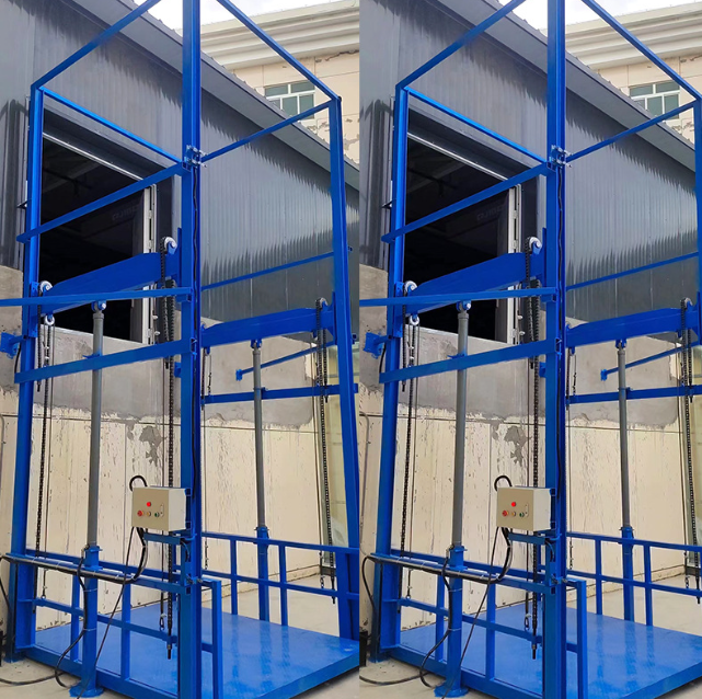 依靠两侧导轨导向 + 液压驱动,运行平稳、安全性高、载重能力强,属于非载人载货专用升降设备。